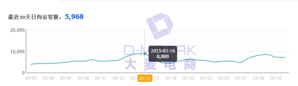 從途中可以看到,原本店鋪訪客數上升趨勢良好的,但是在3月16日突然間下滑,從8800左右下滑到5000左右,下滑幅度43%。說明訪客數直接影響到了店鋪的營業額,而且也說明了當天一定發生了什么事才導致了數據的下滑。