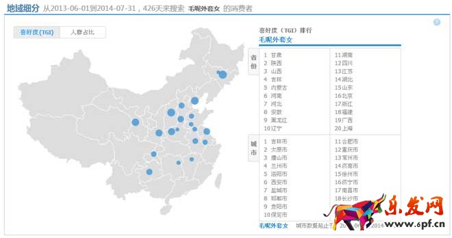 我們繼續,從下圖可以知道喜歡搜毛呢外套女這個關鍵詞都分布在哪些地方還有人群占比各是多少,這個數據適合大家拿去做直通車地域投放,喜好度低的地區就可以不投放,從而提高直通車點擊率。