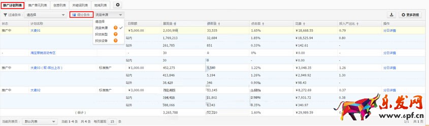 在推廣計劃列表中,我們可以點擊細分條件(圖中紅框處),選擇流量來源,投放類型,投放設備等3個不同選項,流量來源分為站內與站外,站內站外流量對比,可以幫助您了解流量的來源與接下來的投放比例;投放類型分為關鍵詞推廣和定向推廣,定向的作用是精準人群,可根據需要與效果進行投放;設備類型分為計算機設備(PC端)和移動設備(無線端),現在主要是以移動設備為主。