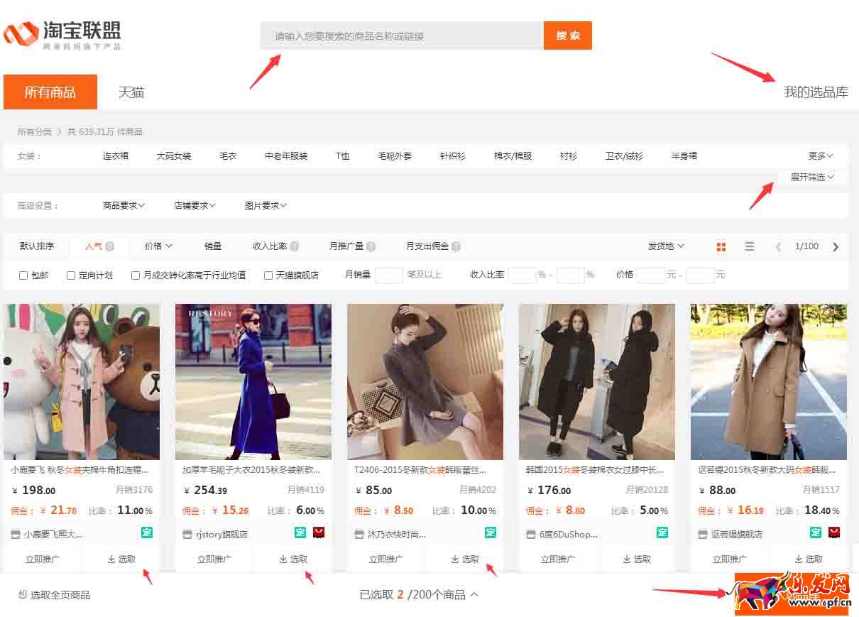 2、聯盟的選品工具,現在上線一個超級搜索,對于個人淘客在原先后臺搜索的時候是比較簡單的,輸入一個關鍵詞后,會出現一大批想接近的寶貝,很多淘客有時候是找合適的寶貝的話比較麻煩,現在上線的這個超級搜索,支持批量選品,批量的生成推廣鏈接,一次可以選品導出200個產品。對于淘客來說這個選品與淘寶搜索很相似。