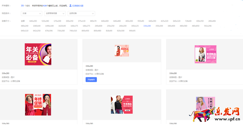 話不多說,我們來看看創意裂變的神奇之處。這里小編以“PC_智能化流量包”可裂變尺寸中的其中一個尺寸336*280為例,首先我們在創意實驗室找到該尺寸創意模板,如下圖:該尺寸下共有35個模板可供挑選,選取其中一個點擊制作。