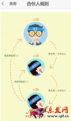 值得注意的是,萌主的合伙人提供是二級分傭和三級分傭和一級分傭的金額是不同的,比如名字這個賣出一個傭金為30的東西,萌主得到的就是30元,這是一級分傭,如果是名字的合伙人或者合伙人的合伙人賣出一個傭金為30元的東西,萌主能拿到的只有10元,二級分傭和三級分傭分到的金額和一級分傭的比例是30%。