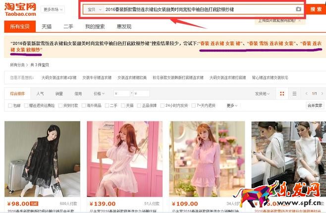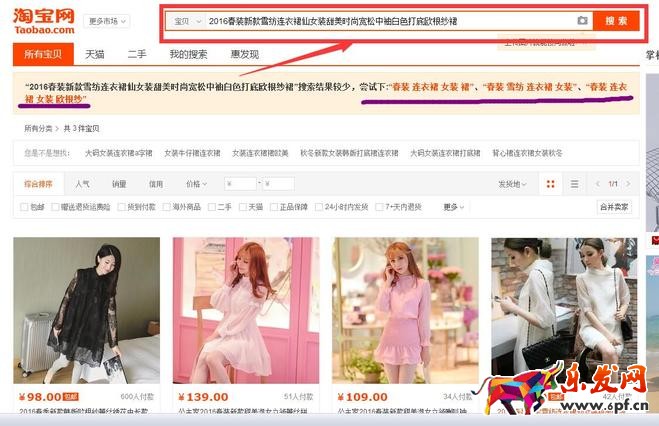 上圖劃線部分顯示:“2016春裝新款雪紡連衣裙仙女裝甜美時尚寬松中袖白色打底歐根紗裙”搜索結果較少,嘗試下:“春裝 連衣裙 女裝 裙”、“春裝 雪紡 連衣裙 女裝”、“春裝 連衣裙 女裝 歐根紗”