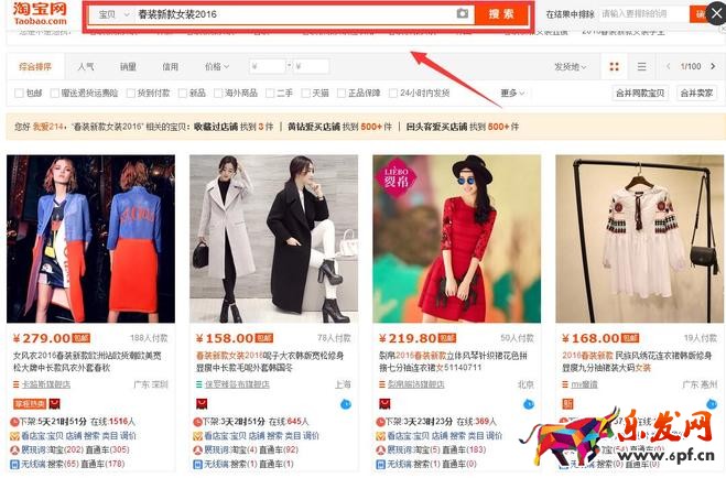 1、大家打開淘寶首頁,搜索關鍵詞?,F在是春裝上新的季節,我以春裝舉例,搜索春裝。然后找到一個寶貝,搜索全標題,會出現如下結果: