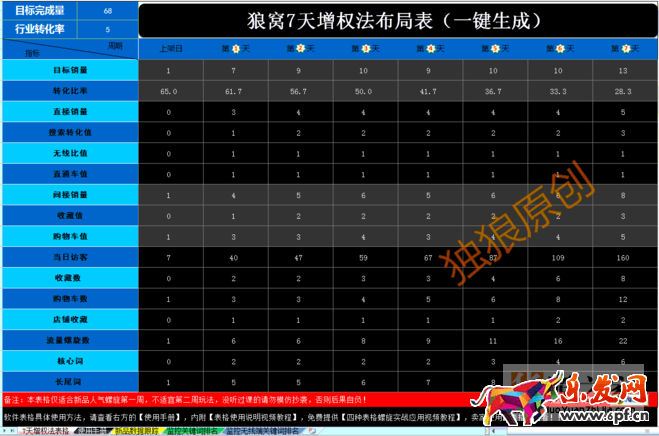 表格簡單來說是一個爆款打造指南,誕生于15年7月份,12月份做了一些大的數據調整更新為2.0版本試用于16年淘寶新玩法(也就是文章的第一張 圖片,上圖是1.0版本),表格是綜合匯聚上百個爆款數據,聚集幾十個類目爆款模型而成,獨創七天增權法快速引爆新品流量,反過來說就是,告訴你一個真正 的爆款長什么樣數據,比如轉化率每天應該怎么引導,流量銷量等等各個維度指標!