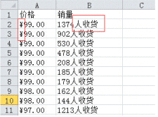 處理數據的核心就是找規律,這里我們可以看到,價格跟銷量大部分是連在一起的,但是部分中間有運費,所以需要刪除有運費的行,具體操作如下: