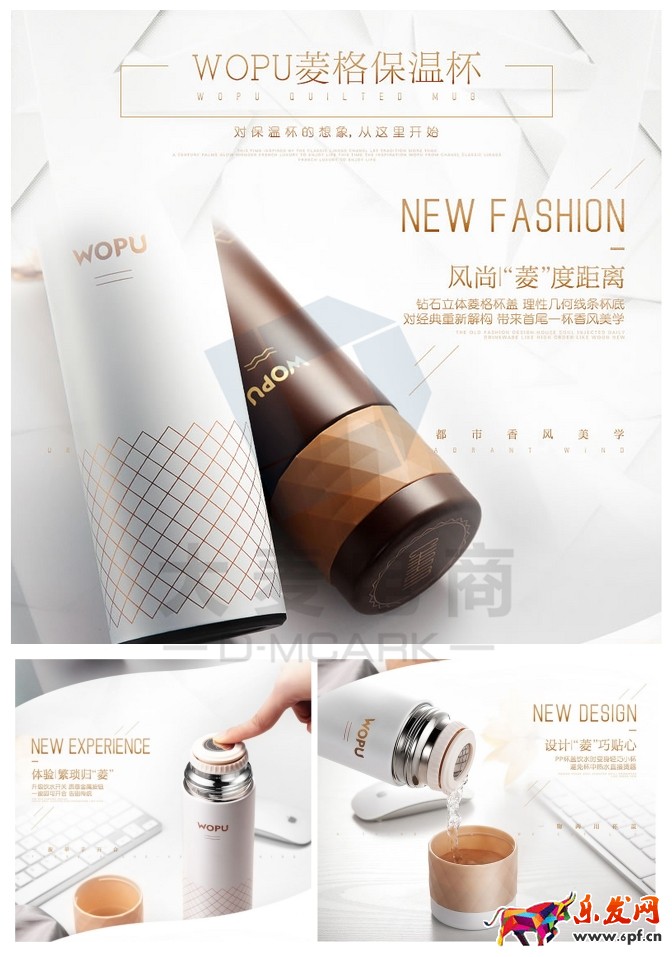 文案聯想將產品賣點進行文案的提煉,統一出能貫穿所有賣點的關鍵字,再進行潤色處理,如下圖將產品的賣點“風尚‘菱’度距離”、”體驗繁瑣歸‘菱’“、”設計‘菱’巧貼心“,很好地將杯型的菱格與每個賣點進行文案的結合,巧妙且恰到好處。