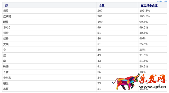 在關鍵詞卡位方面,因為店鋪的基礎比較薄弱,所以盡量的通過關鍵詞避開競爭對手,比較好的是,這類詞比較多,可選擇的余地比較大,通過“情報助手”的分析,可以看到競爭對手最常用的前15位的詞分別是: