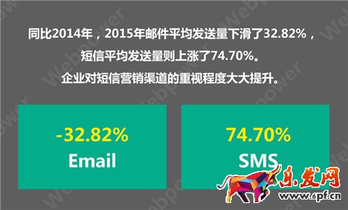 同比2014年,2015年郵件平均發送量下滑了32.82%,短信平均發送量則上漲了74.70%。企業對短信營銷渠道的重視程度大大提升。