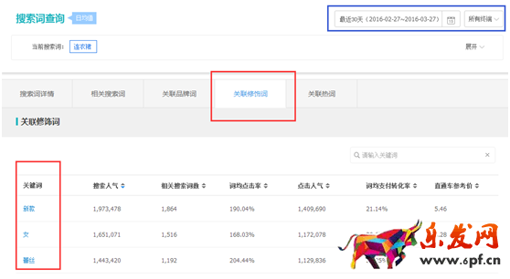 路徑:生意參謀——市場行情——搜索詞查詢,然后選擇看最近30天的數據,輸入一級核心詞(比如:連衣裙)——點擊關聯修飾詞,出現如下結果: