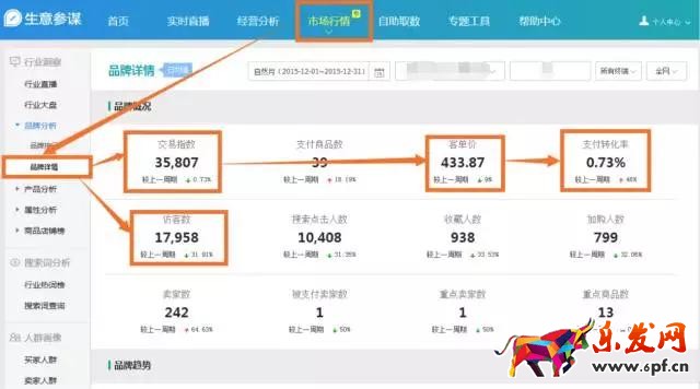 怎么看競爭品牌的基本情況?查看路徑是生意參謀-市場行情專業版-品牌詳情。通過品牌交易指數,我們可以統計該品牌各月份的交易趨勢。然后,可以再關注下該品牌各階段的轉化及客單情況,重點關注的指標如下。