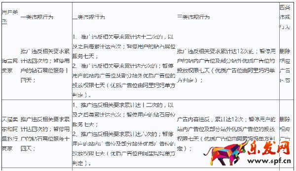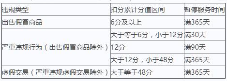 二十五 用戶因違反《淘寶規則》、《天貓規則》或《阿里旅行規則》被處罰的,阿里媽媽除采取本規范第二十三條規定的措施外,同時有權依違規類型與扣分累計分值區間,按下表所列時間中止用戶的鉆石展位服務: