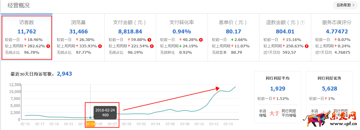 開始推廣直通車之后店鋪的整體流量是在增長的,由原來的400多的流量上升到現在的10000多的流量,提升的也是比較了。