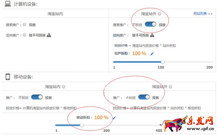 針對上面的情況,我們第一步先把PC和無線的站外平臺關閉,如果定向推廣能開啟的店鋪也建議先關閉,一般來說,這三個投放平臺總體上相比站內的點擊率會比較低,如果開啟會整體拉低整個計劃的點擊率。由于現在的無線端點擊率要比PC端的要總體高出不少,所以無線折扣方面暫時拉升到150%,如下圖。