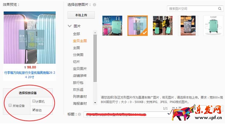 針對展現量更多偏向于PC端,而PC端對應點擊率偏低的問題上,我們一方面提高了無線投放折扣之外,我們可以讓PC端展現比較多的創意圖片只投放到無線端(如下圖),近兩天再觀察對應創意的展現和點擊率情況,如果點擊率還跟不上,操作方面主要就是更換創意圖片了。