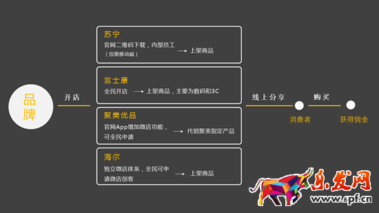盡管微商面臨種種危機,但依舊有很多大品牌奮不顧身涌入這個行業,筆者原以為隨著國美、蘇寧、海爾等知名品牌商的進駐,會給行業帶來新的氣象和樹立新的規范。然而這種“老板帶頭+人人開店+人人分銷”的開店模式并未給行業帶動多大的波浪,相反給業界一種銷量悲慘,不溫不火的感覺。品牌商為什么做不好微商,筆者認為有以下幾個方面的原因(圖為品牌商做微商的幾種方式)。