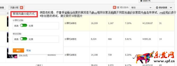 大家看下這里,就是我們的創意圖測試,建議大家4張一組開始測試,流量分配選擇輪播——保證每一個創意圖都得到差不多的展現量,這樣才能知道哪一個圖片比較有優勢,切記不要優選。