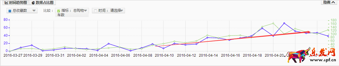 建立一個夏款計劃,前期處于提流量階段,流量上升是比較快的,由于這個階段更多的是要主動寶貝的引流\加購\收藏等數據,下面這個計劃我們可以看出流量上升快,收藏和加購也是有上升趨勢的。