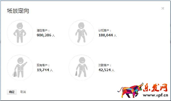 場景定向是在DMP定向還沒有出來前比較常用的一個定向方法,場景定向是由潛在客戶、認知客戶、現有客戶以及沉默客戶四大用戶群體組成,上面這張圖就是我們后臺數據中可以看到的我們圈定出來的四大人群具體數量。