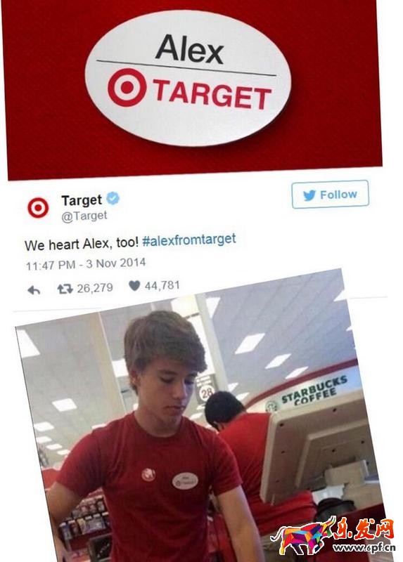 【案例】美國連鎖超市Target某一收銀小哥長得像歌壇小鮮肉JustinBiber,以前沒怎么有人注意,但2014年的11月3號,一張偷拍照片被傳到Twitter上,小哥瞬間變網紅,12個小時內漲粉30萬,還上了不少網站頭條。于是機會來了,Target的社交媒體宣傳團隊身手敏捷,當晚上就在官方Twitter發出一條響應帖子,"WeheartAlex,too",我們也愛Alex。這一條簡單帖子就獲得26000條轉發和44000條贊。員工火了,店鋪也借勢竄紅……
