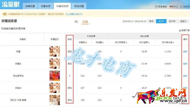 無線端計劃中投放的產品也要根據數據分析,選出更適合無線推廣的寶貝,通過對比寶貝在PC和無線端的引流和轉化能力,擇優選擇。關鍵詞投放帶有手機標的,重點是在投放過程中數據的監控與優化,用流量眼就可以輕松解決問題,流量眼有比生意參謀更強大的數據,可以來監控無線關鍵詞排名情況,持續淘汰不能帶來展現、排名低的關鍵詞,把排名好轉化高的優質關鍵詞重點優化,并可以用于標題優化,把無線端的流量快速提升。