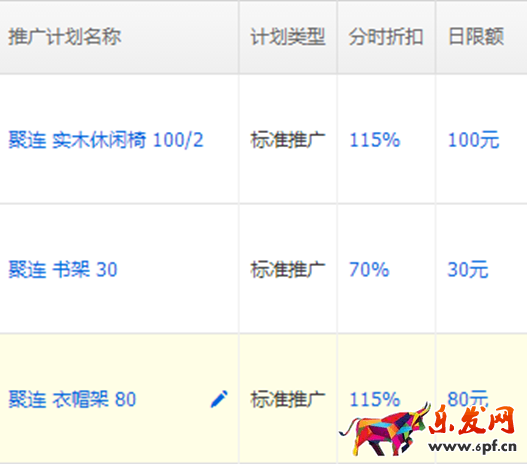 每種款式的寶貝建不同的計劃分開推廣,比如下圖,椅,書架,衣帽架就分成了三個計劃,設置不同的分時折扣和限額以及無線端的比例。