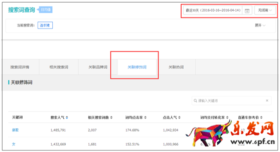 打開生意參謀,看市場行情——搜索詞分析——搜索詞查詢,輸入產品詞,我們以“連衣裙”為例(連衣裙:你妹啊,有意思么,你能不能換一個!),選擇最近30天的數據,選擇無線端(不要問為什么,累),然后點擊關聯修飾詞: