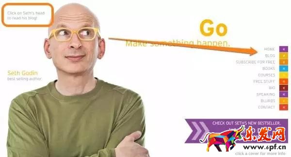 研究表明,我們在加工視覺效果的時候顯著快于文本。例如,你可以看看Seth Godin是如何在他的網站上使用圖片的。不是以傳統“博客”鏈接的方式,網站要求你點擊Seth的頭閱讀他的博客。結合大膽的顏色,這種視覺可執行度比文字鏈接強大許多。