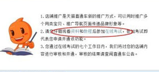 3.頁面中顯示有店鋪推廣的考試鏈接,請先詳細閱讀教程后參加考試,80分為通過,考試通過后7個工作日內審核,審核結果以旺旺消息與直通車公告給予通知: