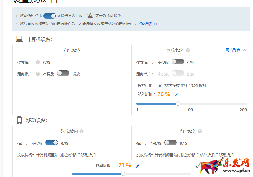 前期可開放PC端搜索推廣和移動端站內推廣,站外和定向可以先不投,先做關鍵詞搜索推廣,數據起來之后再逐步開通站外和定向測試效果,移動端的折扣可以高于100%,主做無線端的話,可以提高到400%。