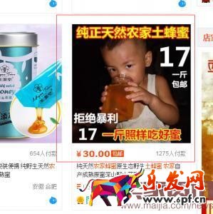 例如:農家土蜂蜜這家店鋪,主圖設計讓消費者有眼前一亮的感覺,借用農家小孩從最實在的本質透露了自己產品的正宗,通過農家小孩加上黑色背景讓買家感覺到自己產品的健康營養,這張主圖最重要的核心重點是農家小孩,利用小孩隱形的說明自身產品的優勢,也進而一步的展示了自身產品的賣點。
