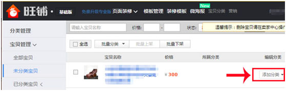 1、點擊左側導航的“寶貝管理”,對未分類寶貝進行添加分類;