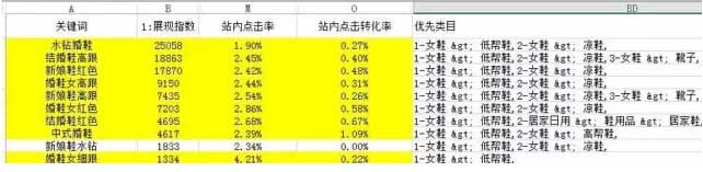 這里可以把每個詞到流量解析中去查找一下這個關鍵詞的展現指數,點擊率,轉化率,以及它的最優類目,然后放到表里記錄下來,或者也可以用軟件來篩選,最終篩選出適合您的關鍵詞。