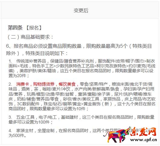 淘寶規則,各類活動規則一直在變化,給了賣家們更多的機會,此次淘搶購報名商品必須設置商品限購數量,特殊行業中增加了消費卡、購物提貨券和餐飲美食!