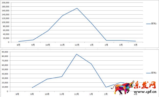 這是去年下半年到今年年初,口罩類目銷量TOP1/2的兩款寶貝的每月總銷量分布數據,為了可視化分析,我們列出了趨勢圖,如下: