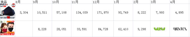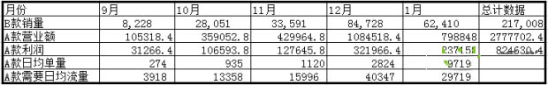 2、根據銷量趨勢圖不難發現口罩的銷量峰值期是在12月份,銷量下滑期是1月份,銷量陡增期是9月份中下旬,過完年的銷量已經寥寥無幾了,所以做銷量沖排名一定是9月份中下旬和10月份,爆發期是11月和12月份,1月份要甩尾貨。所以我們需要對A/B兩款寶貝從9月份到1月底的數據進行假設和分析: