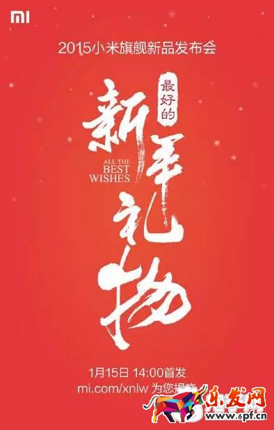小米2015年的新品發布會海報也采用了中間對齊的形式,讓關看者很容易的就視線聚焦到中間“新年禮物”的重要信息上。