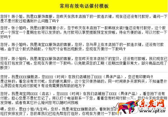 電話催付是在一些特定的活動中,比較限時活動,或是限購活動中可以使用,一些大型的像雙十一,雙十二的話看情況,如果是金額比較大的可以選擇用電話催付來做,如果是小金額就沒這個必要。要做到電話催付有效果,除了聲音甜美,清晰之外,還要懂得一些溝通的話術,否則會適得其反,所以下面給大家整理了一些電話溝通中常用到的話術,希望能夠幫到大家,以下是部分常用的,由于頁面原因,其它催付的話術大家可以直接加群找管理員索要,非常全面。
