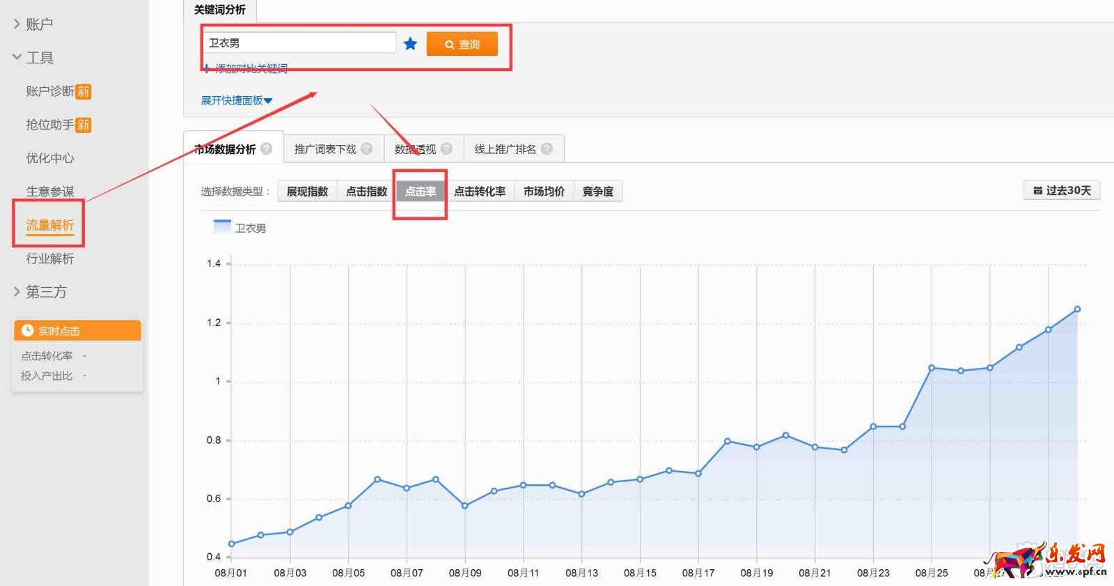 沒錯,第一個需要優化的數據就是點擊率,因為不管是提高直通車的質量分也好還是淘寶搜索排名也好點擊率都是影響的一個很關鍵性的因素,當然具體占比權重多少,我這邊也沒法給出具體的數據,只能通過自己的經驗給到大家一些建議,盡可能提高點擊率,對于點擊率的話,因為我沒有訂購生意參謀-行業詳情,如果想看到我們行業精準的數據可以訂購個,土豪隨意,我這邊當時也就是借鑒了一下直通車里面的流量解析功能,我認為也夠用了,畢竟中小賣家能省點是點。