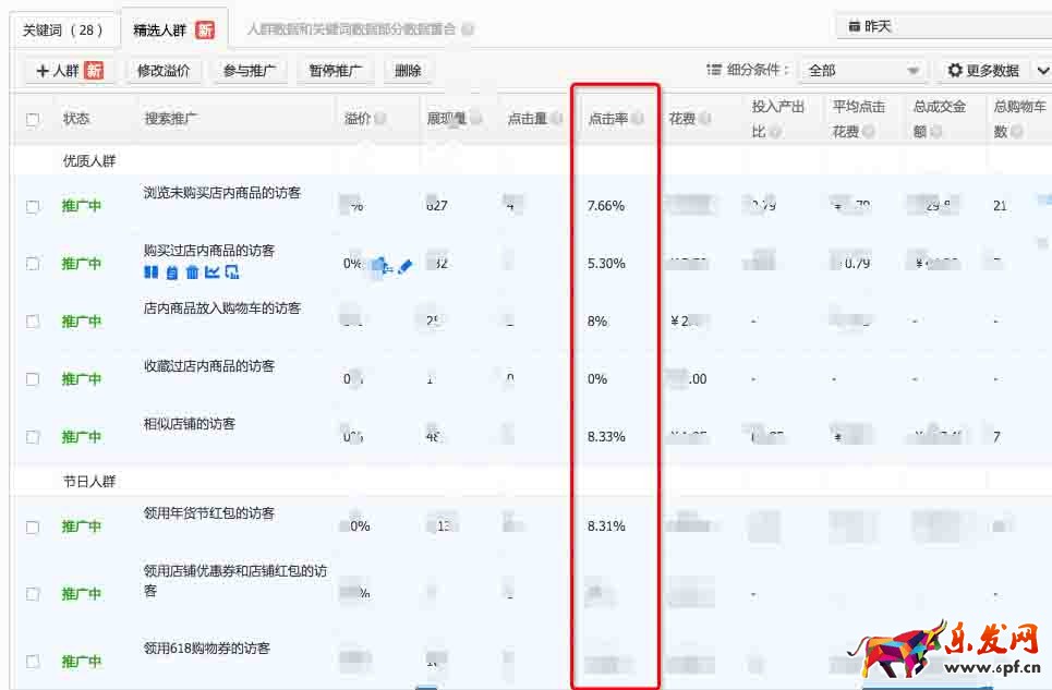 經過準備期的自定義人群和相似店鋪的人群覆蓋,蓄水期的店鋪瀏覽和活動人群覆蓋,那么在預熱期的時候我們要根據之前的人群投放數據,選擇點擊率高的人群繼續投放,這些都是精準的人群(人群標簽也是需要測試的)。