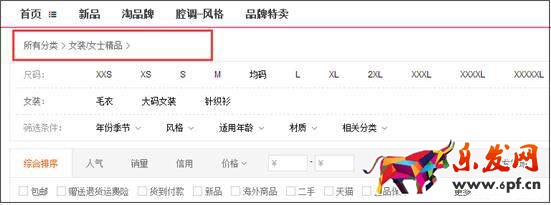 然后你點擊里面的前臺類目,比如你點擊“小西裝”,出現搜索結果頁,然后你在搜索結果頁有沒有跟你一樣(或者相似的寶貝),如果沒有的話就換一下,點擊別的,如果有的話,你就看一下搜索結果頁的右上角,下圖紅框里面的東西,那就是你要選擇的類目。