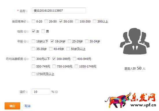 (2)自定義人群(全開):①逐個添加項目(按性別、年齡、價格區間等一一排列組合);②采用上坡法、下坡法。溢價10%-50%