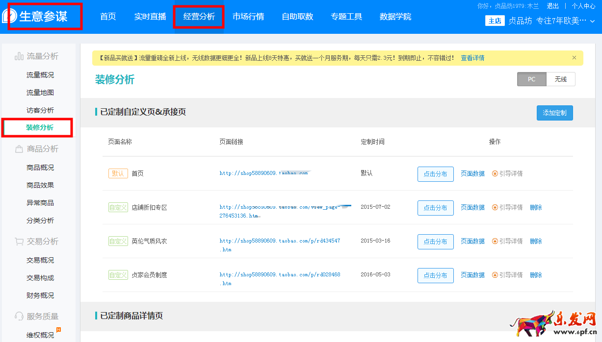 然后裝修的分析有pc電腦端的,跟無線端的,二級頁也是可以看到的,可以自己添加別的頁面,然后放一天就可以看到了。會延遲一天的,就是今天的只能看到昨天的,然后點擊發布就可以看到頁面了,如下圖: