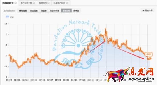 而進一步通過下圖“競爭度”和“點擊指數”分析,可以了解到這個品類產品的市場上升期是在8月份,而在雙11后市場開始萎縮。但通過趨勢可以清晰看到市場的萎縮速度是沒有市場競爭度和上面的市場競價下降的速度快了。換句話說,這對于雙11后該品類的商家來說也是一次不錯的商機,因為可以用更低的引流成本獲取更高的推廣效益了。此時只要我們的利潤率是高于3成的情況下,那么峰值10%的店鋪成交額作為推廣預算也是可以接受了。因為直通車帶動的不僅僅是報表上的數據,更多的收益是來自帶動作用下的自然流量了。因此市場節奏點的把控,哪些品類的市場具有引流成本上的商機也是我們需要考量的指數之一。