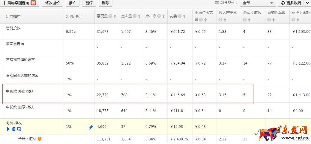 可以看到,ppc在0.64的情況下,投產只有2.32,也就是說,優化PPC的時候,我們一般是習慣整體調控,也就是說,今天PPC是0.8元,ROI2.5,我們想把投產做到3,那么PPC降到0.64就可以了。(至于為什么是0.64,我這里不再去算)但是,我們有部分實際上不需要降價,剛才那個ROI 2.5,細分到關鍵詞和定向,關鍵詞的ROI如果是3,定向的ROI是2,花費一樣。那么關鍵詞是不需要降的!所以說我們要單獨建立定向計劃!本身定向和關鍵詞的轉化都差很多。
