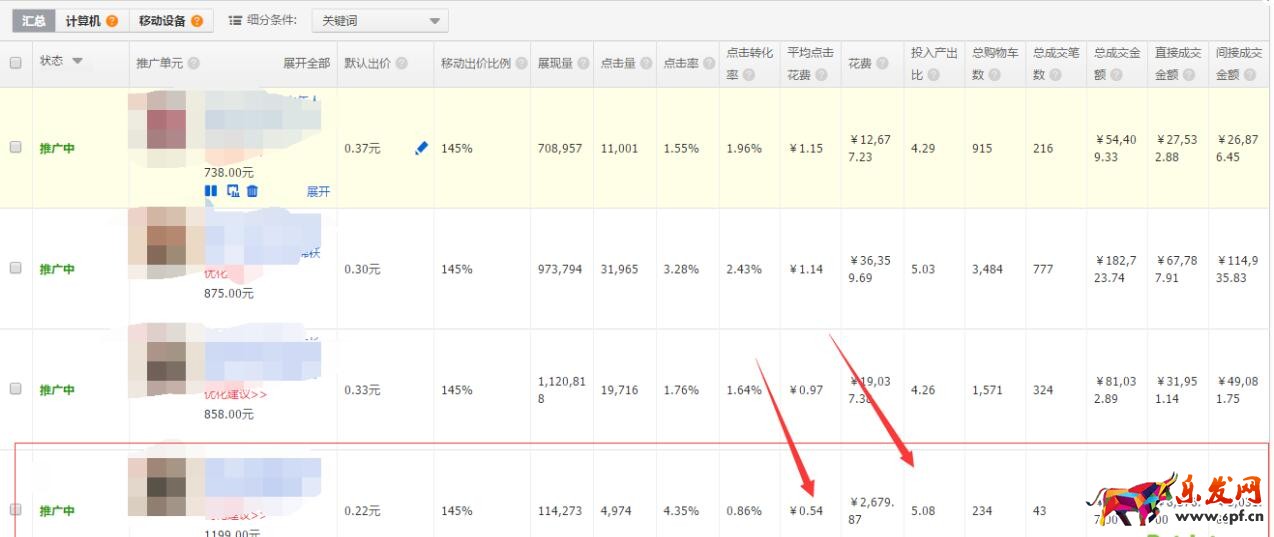我這里主要談第二點:如下圖,我們看到第四款的關鍵詞數據,這里重點只看PPC和ROI。