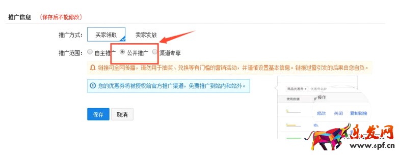 我們要設置無線端優惠券的前提是我們要在PC端把無線端的優惠券設置好后才能去無線端進行設置,在這里需要注意的是,如果要在無線端設置優惠券的話,必須要在PC端的推廣范圍處設置公開推廣,否則是無法再無線端設置優惠券的。