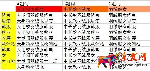 以羽絨服作為例子,測款和沖刺的時候我們可能調用的都是A組的精準詞,隨著流量需求的增大,我們會逐層把精準度要求降低,B組、C組、D組、一組一組的都要加進來。當然每組加進來的時候都需要篩選和跟蹤的,最好能弄個表格,大致看下數據到什么程度,方便后期決策。