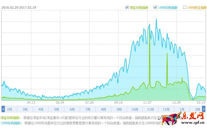 從下圖“童棉衣”全年1688采購指數情況的趨勢圖可以看出(阿里指數給出的是“類目”的大盤數據,而不是細分的“連衣裙”、“半身裙”...這種很細分的數據,而生意參謀是可以做到這一點的,所以想要更精準的掌握市場趨勢,還是去使用生意參謀——市場行情),“童棉衣”在9月到1月,1688市場采購量多,我們可以大體推測“童裙”的黃金銷售期就是這個時間段,之后下滑趨勢明顯。