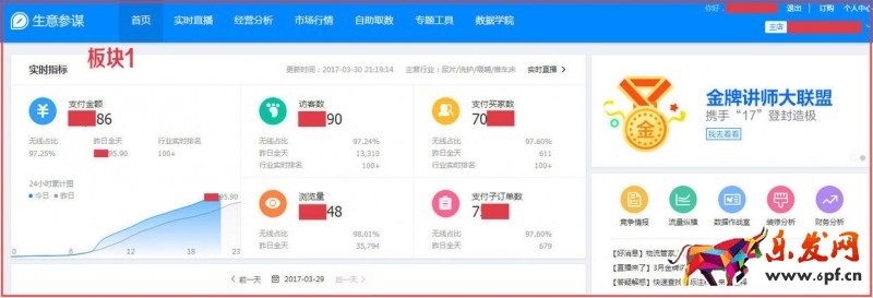 從板塊1里還能看到今天和昨天銷售數據的實時對比、無線數據占比以及行業實時排名,方便我們靈活調整運營策略。訪客少了我們就尋找訪客少的原因,金額少了就尋找金額減少的原因,瀏覽少就尋找瀏覽量減少的原因,通過數據可以嚴密監控店鋪異常。